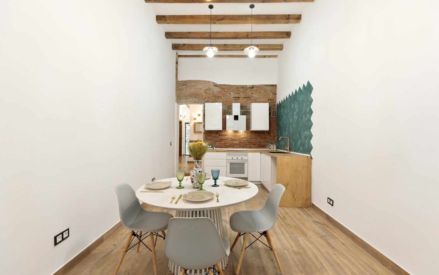 Una casita no tiene por qué ser una casa, ni el diminutivo implica que sea pequeña. Por ejemplo, esta vivienda es un piso, pero tiene todo el buen rollo de una casa de pueblo, acentuado por los detalles de piedra, ladrillo y madera originales, y por ese acogedor patio. Y el diminutivo es una forma cariñosa de hablar del hogar, cuando digas frases como “qué a gusto se está en casita” o cuando escuches decir “¡vaya casita tan chula que te has comprado!”. Un piso con alma de casa en un barrio con alma de pueblo: así es tu nueva casita en Barcelona.