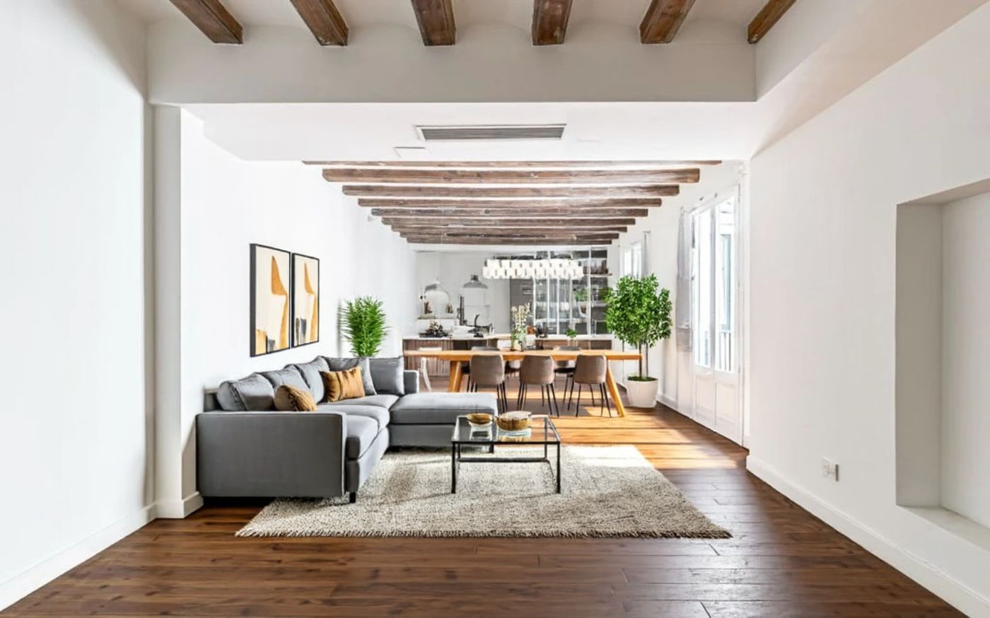¿Cómo sería la vida en este piso cuando se construyó, allá por el 1900? Solo con ver el amplio portal, con espacio para carruajes, es fácil imaginar que en esta finca vivían familias acomodadas. ¿Y las fiestas que se montarían con un salón de estas dimensiones? Un vals por aquí, un foxtrot por allá, una copita de cava y algo de absenta para los más aventureros. Excepto el tema del carruaje, nada te impide revivir aquel espíritu de antaño, y con las comodidades de la actualidad. Es fácil idealizar el pasado, pero es mucho más fácil disfrutar del presente cuando tienes un piso como este.