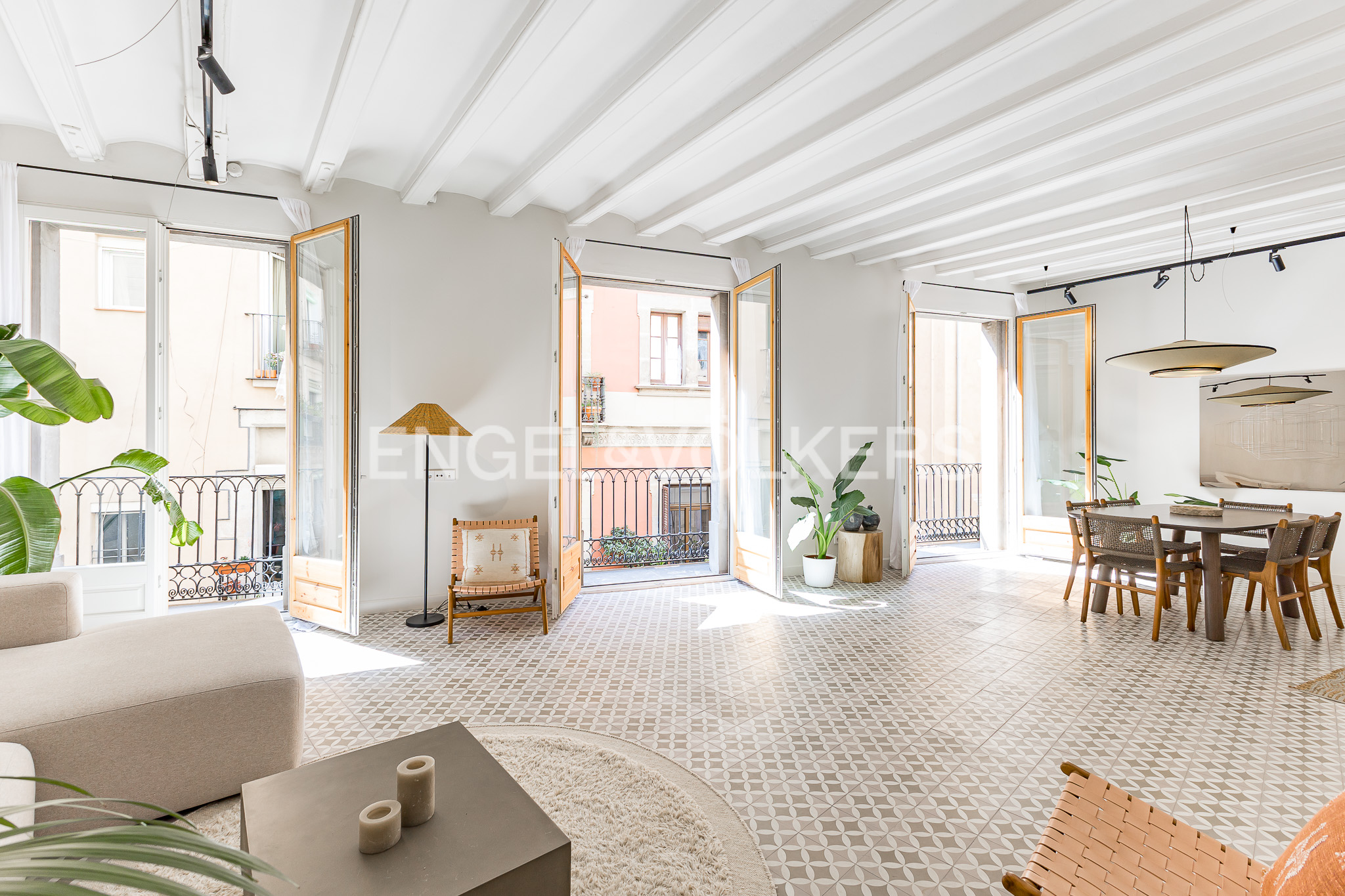 En una finca clásica del encantador barrio del Born, presentamos este exclusivo apartamento de 106 metros cuadrados, recientemente renovado con un proyecto cuidado y funcional que respeta la esencia del edificio mientras aporta un aire contemporáneo y acogedor. La vivienda es fruto de una segregación inteligente, que ha permitido crear un piso amplio, moderno y perfectamente distribuido. Cuenta con dos dormitorios en suite, ambos con baño privado, lo que garantiza privacidad y confort tanto para una familia como para quien quiera combinar vivienda y espacio de trabajo. La zona de día es abierta y luminosa, compuesta por una amplia sala de estar que se conecta fluidamente con la cocina, moderna y totalmente equipada. Este diseño abierto potencia la luz natural y favorece un estilo de vida social, ideal para recibir amigos o simplemente disfrutar del día a día en un entorno amplio y funcional. Uno de los grandes atractivos del piso son sus tres balcones exteriores que se asoman a la calle, ofreciendo no solo luz natural durante todo el día, mas también una conexión directa con el vibrante ambiente del barrio. Aunque el piso ha sido completamente renovado, se han conservado algunos detalles originales con que aportan textura y autenticidad al conjunto, sin renunciar a la comodidad del diseño contemporáneo. Entre sus características destacan: 2 habitaciones en suite Cocina abierta con electrodomésticos integrados Espacios amplios y bien proporcionados 3 balcones a la calle Reforma integral con acabados actuales Climatización por conductos Un apartamento pensado para quienes valoran el diseño, la ubicación y la comodidad, en una de las zonas más deseadas de Barcelona.