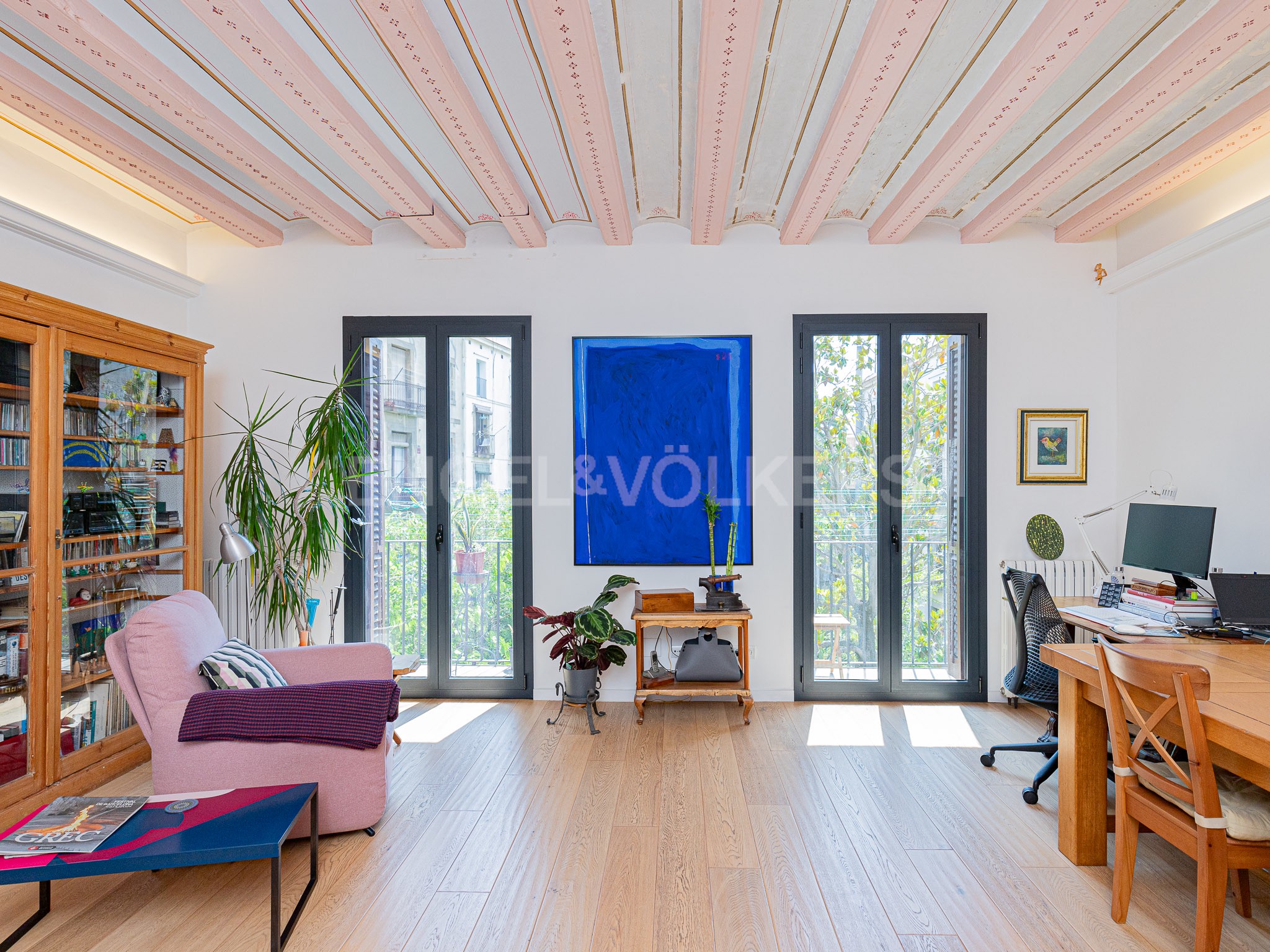 Esta espectacular propiedad de 133m2 construidos en una finca clásica de 1865 y con ascensor, se encuentra en la cuarta planta real y en una de las calles con más encanto de toda la ciudad. Al entrar en la vivienda un ancho pasillo nos lleva hacía la derecha a la zona del día, hacía el fondo. En este gran espacio que mira a un bonito patio de manzana lleno de vegetación muy único dentro del barrio, vemos que los techos han sido restaurados y rescatado las pinturas originales sobre la volta catalana, además de tener bonitos suelos de madera, carpintería de doble cristal y marcos oscuros y sobre todo teniendo un espacio amplio y agradable. Volviendo por el pasillo vemos a un lado un espacio ideal para despacho que conserva aún los suelos hidráulicos originales, que encontraremos también más adelante en una de las habitaciones dobles. La tercera habitación donde cabe una cama doble está justo en frente y junto a ella uno de los dos baños completos de la vivienda. En el corazón de esta casa encontramos la cocina con comedor de diario. Este espacio ha sido también reformado en su totalidad y utiliza materiales y electrodomésticos de gran calidad. Dos patios interiores del edificio aportan luz a esta zona media de la vivienda, que es tan difícil de encontrar en las casas más grandes en Barcelona. Y yendo desde la entrada por el pasillo hacia la parte izquierda encontramos dos habitaciones más, dobles, que a su vez están conectadas por una bonita puerta de madera original, pero que se pueden separar perfectamente y actuar como espacios independientes. Ambas habitaciones tienen balcones hacia la calle principal. Al dormitorio con baño ensuite completo se puede acceder desde la habitación contigua doble o desde el walking-in-closet. Es una pieza llena de encanto y a su vez con una reforma moderna pero que respeta los elementos originales de las fincas regias del siglo XVIII. El piso y el edificio tiene valor patrimonial con doble catalogación de protección porque hay restos de muralla en los cimientos y por ser histórico.